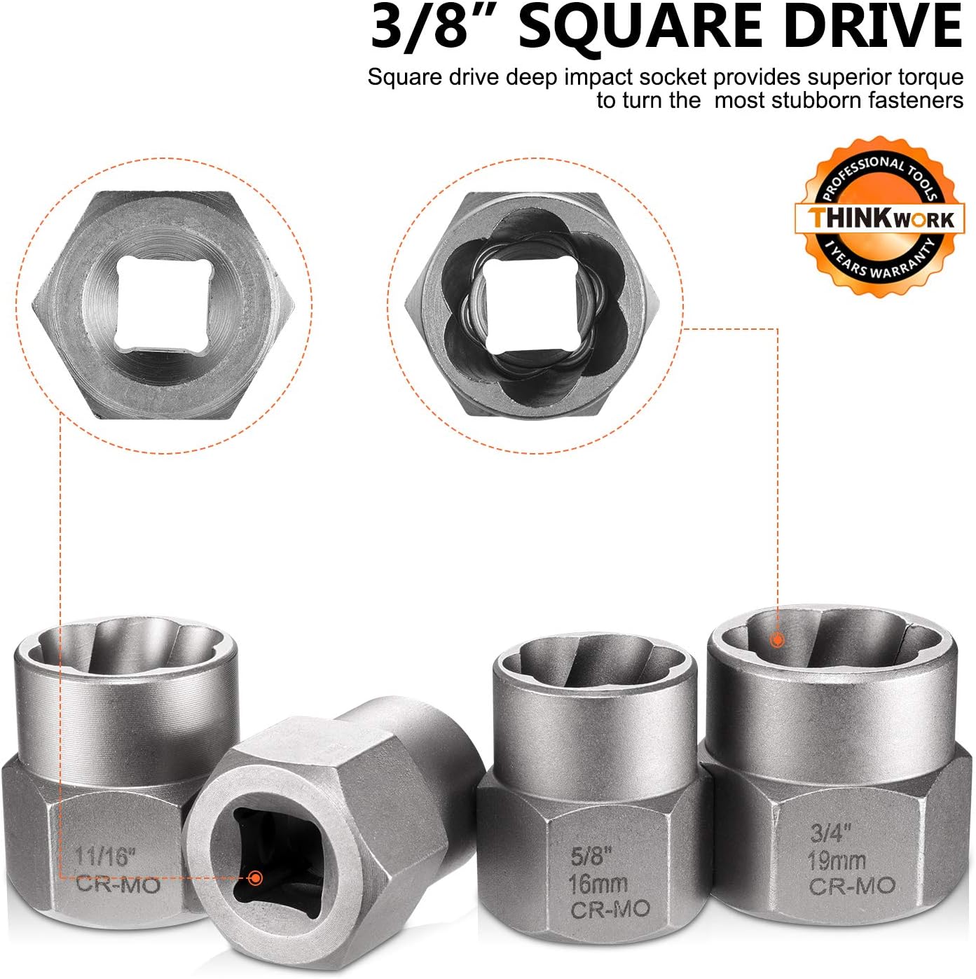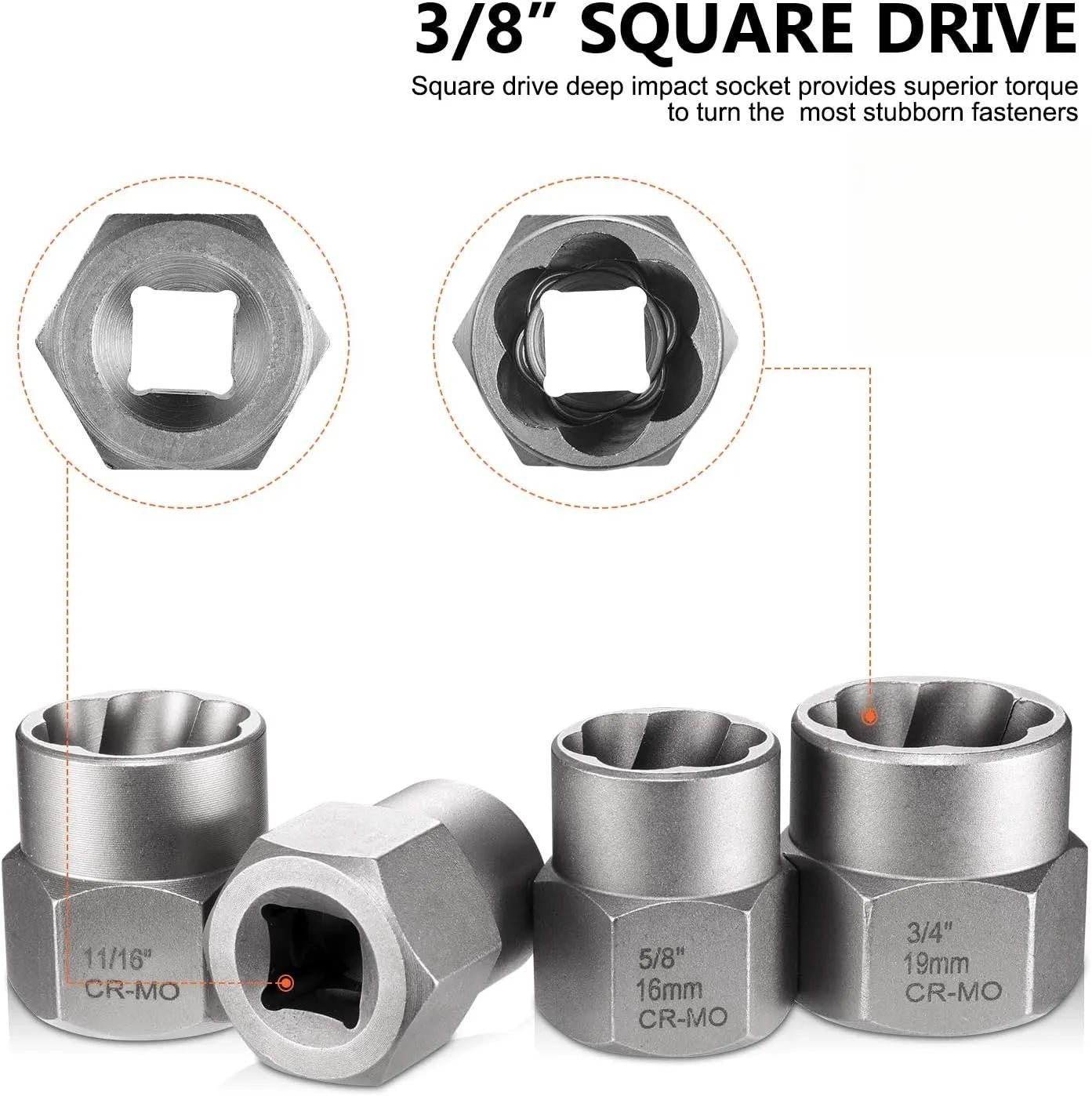 ★ACCURATE AND DIVERSE METRIC SIZES - 13-piece larger sized nuts or bolts. And sockets work on SAE/Metric sizes - 1/4”,5/16”(8mm),3/8”,10mm,7/16”(11mm),12mm,1/2”,13mm,9/16”(14mm),5/8”(16mm),17mm,11/16”,3/4”(19mm), include the 3/8 "to 1/4"hex. Impact square drive all are 3/8" drive, for all kinds of job applications.
