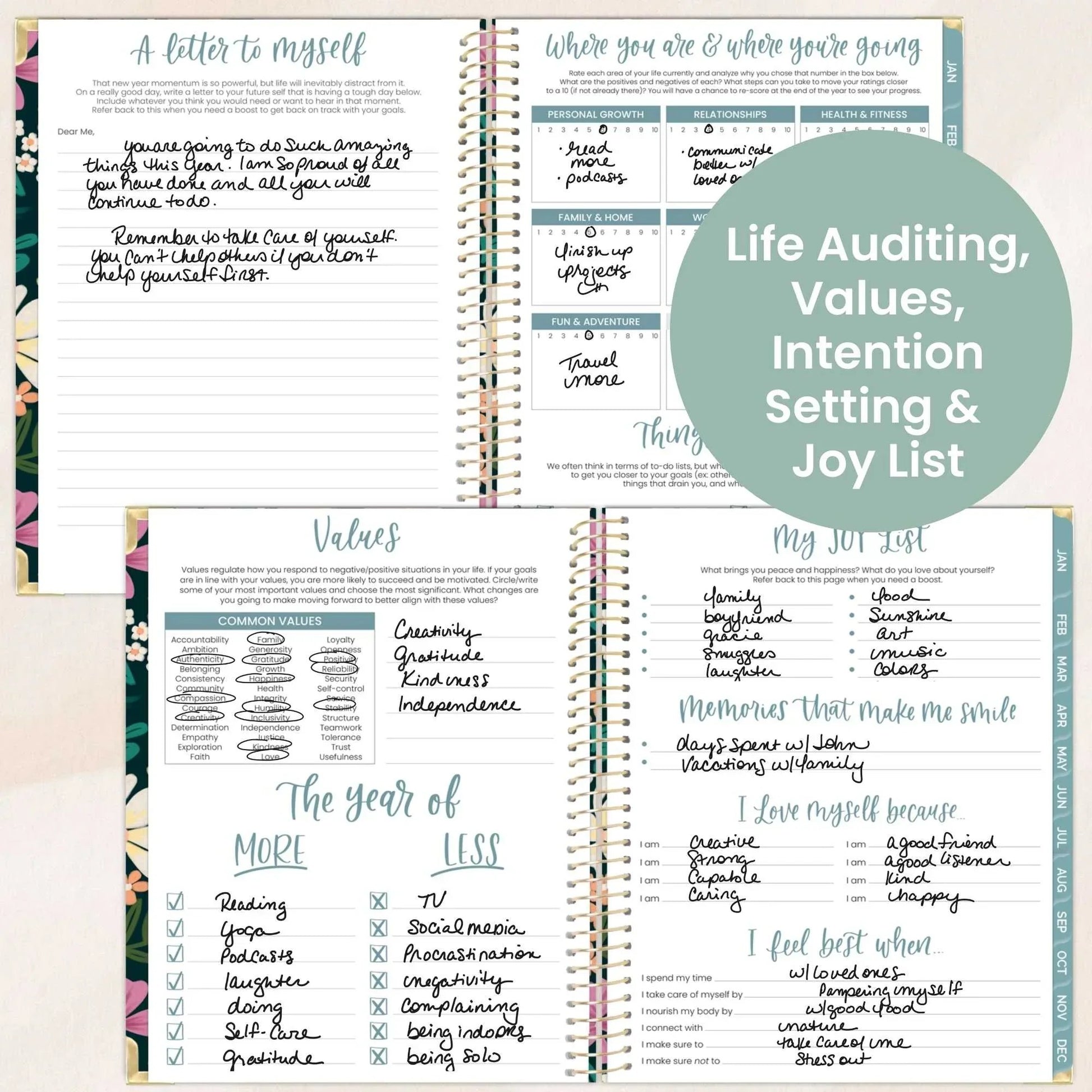 - Joy list, goal setting, and full vision board layout