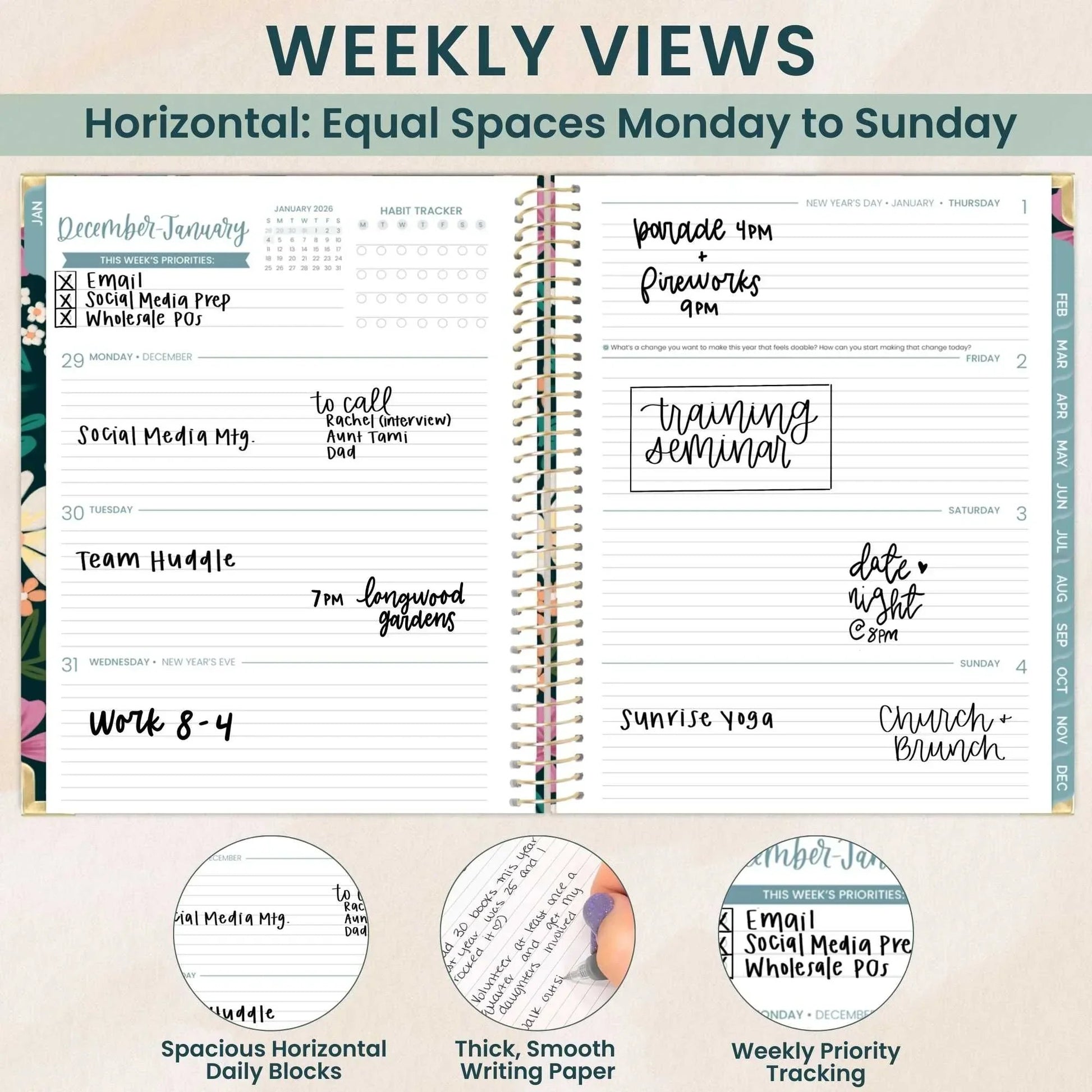 - ✅ Extra-Spacious Weekly Layouts: Horizontal spreads with equal space for each day, plus dedicated sections for notes, weekly priorities, and habit tracking.