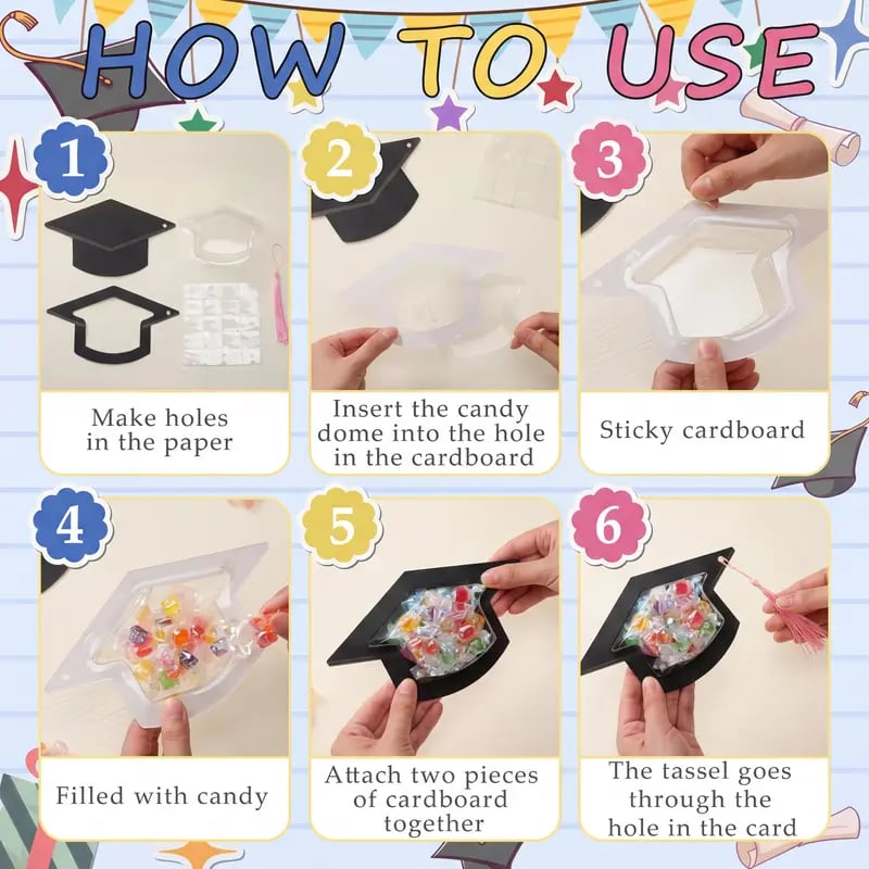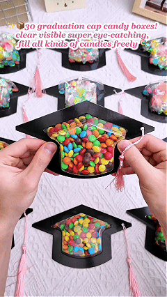 Easy to Use: just need to insert the transparent graduation cap blister into the hole in the middle of the patterned cardboard, then fill it with your favorite gift, glue the two pieces of cardboard together, and finally tie the tassel; You'll get a graduation cap full of candy
