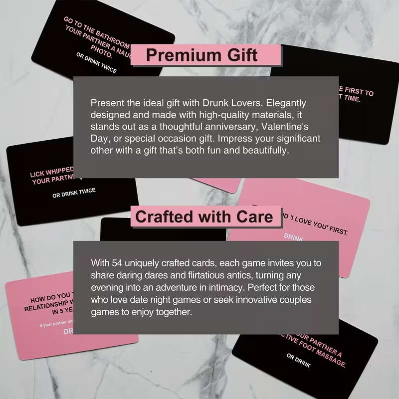 DIVE INTO FUN AND FLIRTATION With 54 uniquely crafted cards, each game invites you to share daring dares and flirtatious antics, turning any evening into an adventure in intimacy. Perfect for those who love date night games or seek innovative couple games to enjoy together.