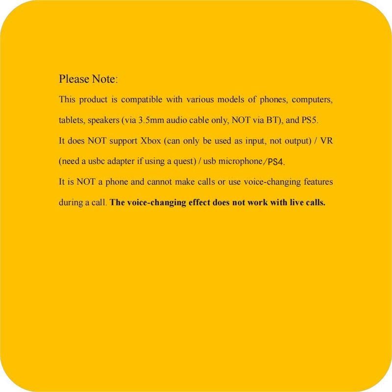 Please Note: This product is compatible with various models of phones, computers, tablets, speakers (via 3.5mm audio cable only,NOT via BT), and PS5. It does NOT support Xbox (can only be used as input, not output) / VR (need a usbc adapter if using a quest) / usb microphone / PS4. It is NOT a phone and cannot make calls or use voice-changing features during a call. Doesn't work with live calls.