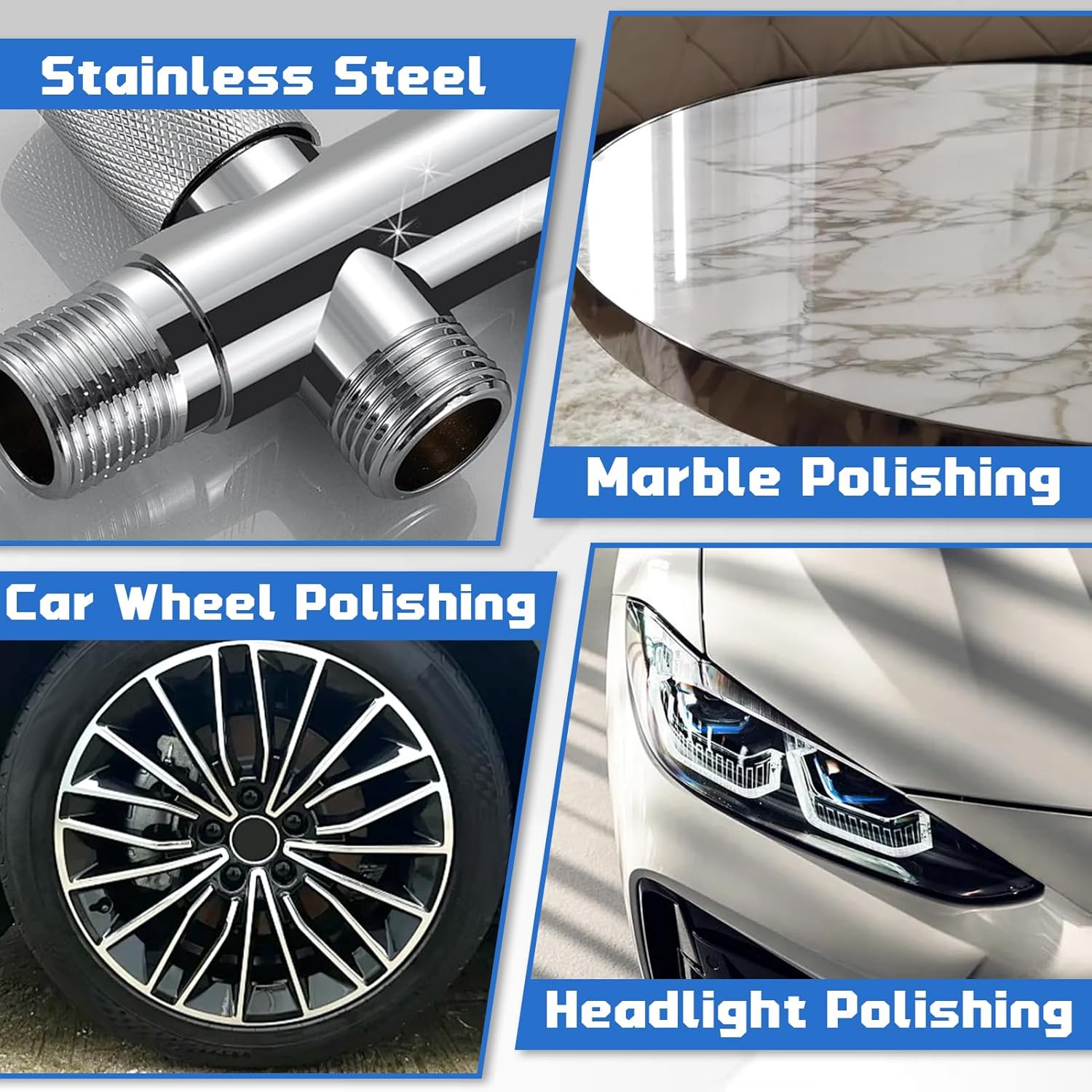 Effectively polishes stainless steel, aluminum, brass, cast iron, glass, marble, wood floors, car paint, and jewelry. Whether removing rust, restoring shine, or smoothing surfaces, this wheel polishing kit delivers professional-grade results every time