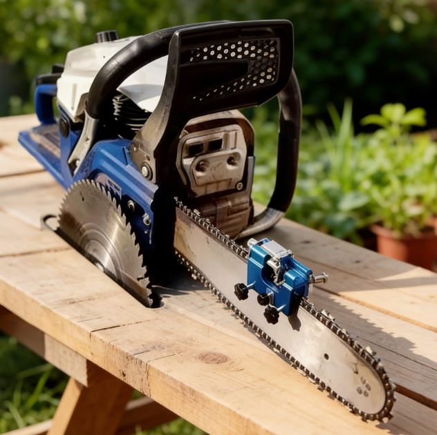 Before-and-after images showcase its efficiency, turning dull chainsaw blades into sharp tools ready for any task.