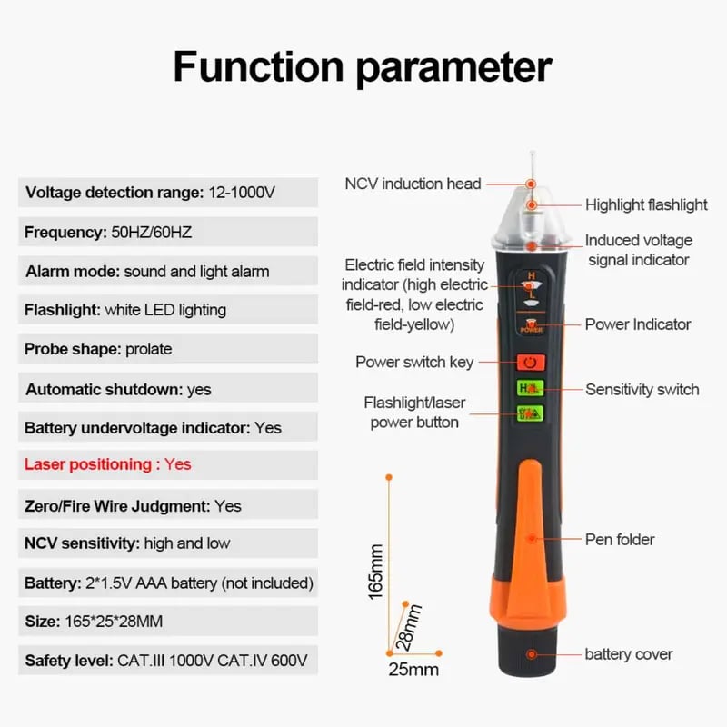 Wide Voltage Range: Capable of detecting voltage in the range of 12-1000V AC/DC, making it versatile for both household and industrial use.