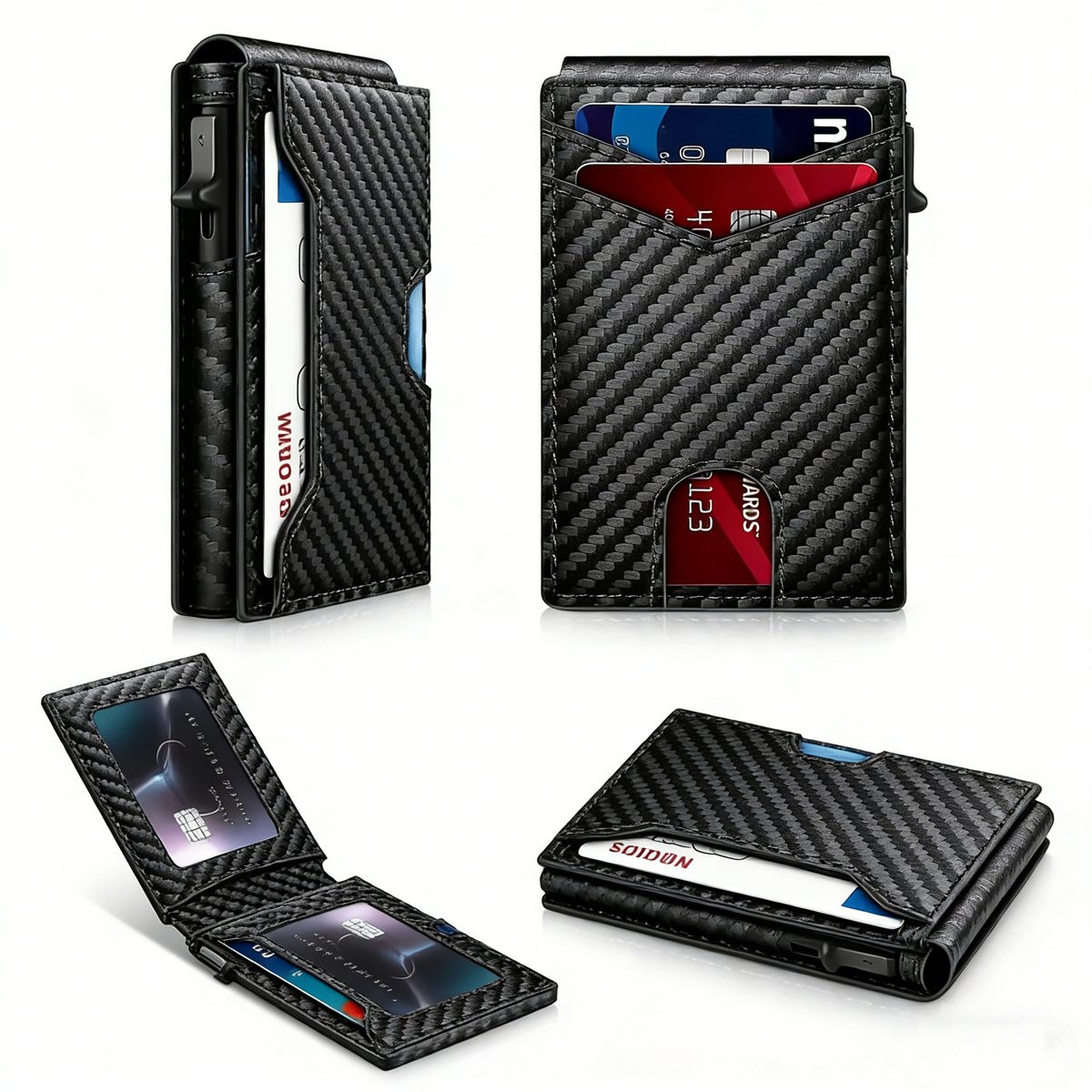 This slim wallet shields your cards with military‑grade RFID blocking, all wrapped in aluminum that’s scratch‑resistant and ultra‑light. The one‑touch pop‑up mechanism gives you instant access to your most used cards — no fumbling, no clutter. 🛡️