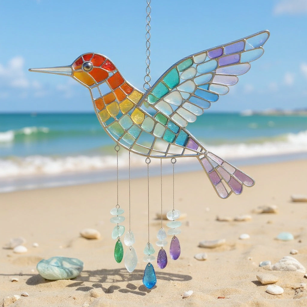 🌈Meaning:The hummingbird symbolizes joy, resilience, and the beauty of living in the moment, while the rainbow sea glass embodies hope, renewal, and the magic of nature’s leftovers. Together, they tell a story of transformation—turning ocean-tumbled glass into a work of art, and ordinary spaces into havens of color and sound. It’s a reminder to embrace life’s little joys and find beauty in unexpected places.